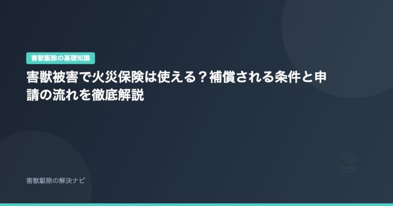害獣駆除の基礎知識 害獣被害で火災保険は使える?補償される条件と申請の流れを徹底解説 📅 2026年2月12日 「害獣被害の修繕に火災保険は使えるの?」「ネズミが配線をかじって漏電したけど保険で直せる?」——害獣被害に遭ったとき、修繕費用を火災保険でカバーできるかどうかは…