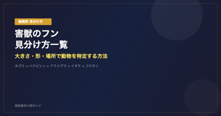 害獣駆除の基礎知識 害獣のフンの見分け方一覧|大きさ・形・場所で動物を特定する方法 📅 2026年3月10日 「家の中に黒い小さなフンが落ちている」「天井裏にフンが大量にある」——フンを見つけたものの、何の動物のフンかわからないという方は非常に多いです。 フンの形・大き…