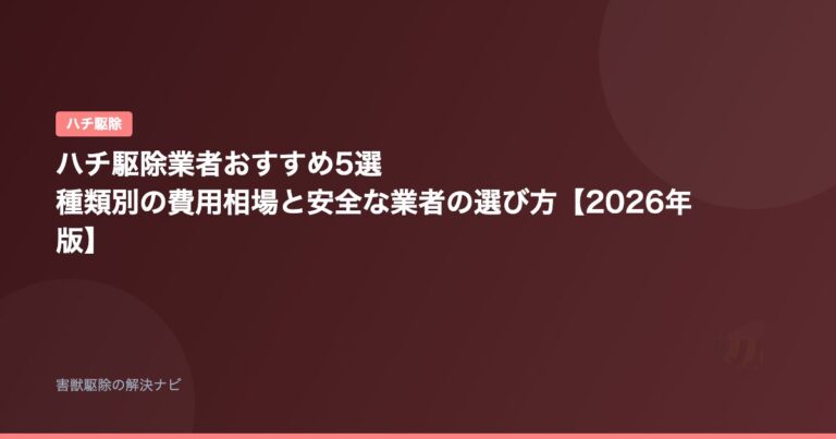 ハチ駆除 ハチ駆除業者おすすめ5選|種類別の費用相場と安全な業者の選び方【2026年版】 📅 2026年2月13日 「家の軒下にハチの巣ができた」「スズメバチが玄関周りを飛んでいて怖い」——ハチの巣は放置するほど大きくなり、攻撃性も増して危険度が上がります。 特にスズメバチの…