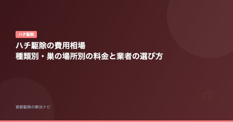 ハチ駆除 ハチ駆除の費用相場|種類別・巣の場所別の料金と業者の選び方 📅 2026年2月12日 「ハチの巣の駆除はいくらかかるの?」「スズメバチとアシナガバチで費用は違う?」——ハチの巣を見つけたとき、費用がわからないまま業者に依頼するのは不安ですよね。 …