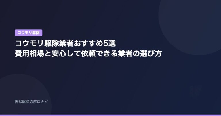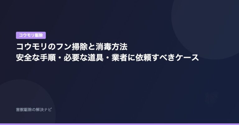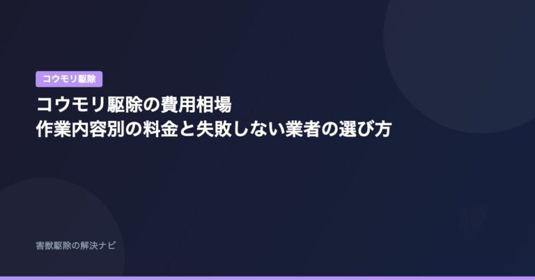 コウモリ駆除 コウモリ駆除の費用相場|作業内容別の料金と失敗しない業者の選び方 📅 2026年2月12日 「コウモリ駆除を業者に頼むといくらかかるの?」「見積もりが適正かわからない」——コウモリ被害に遭ったとき、費用相場を知らないまま依頼すると割高な金額を請求される…